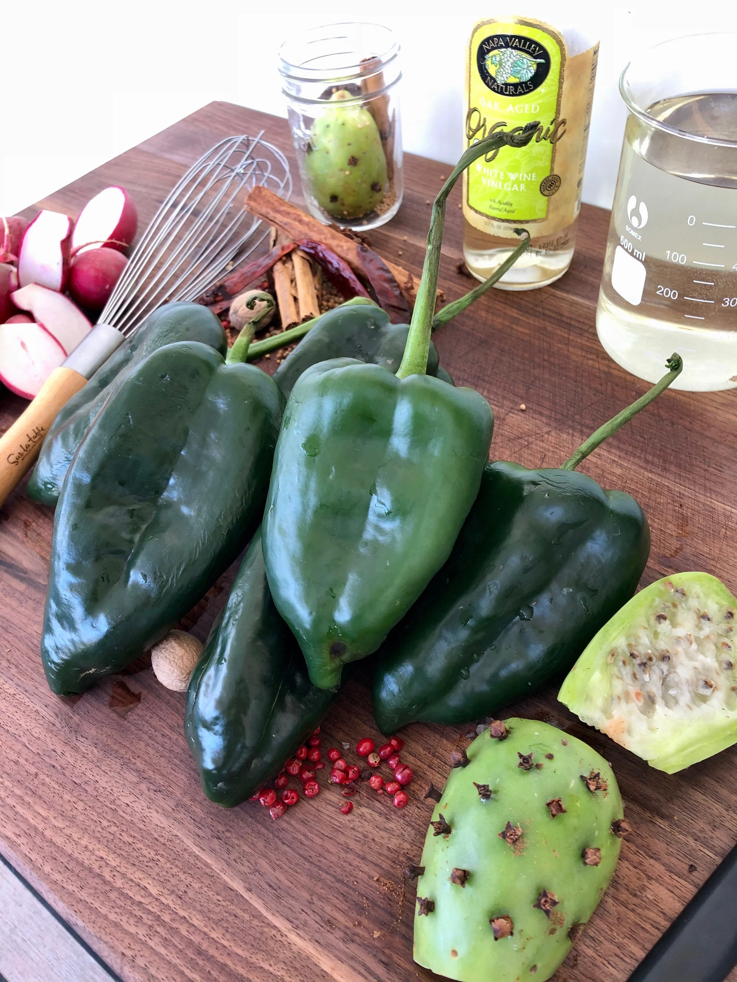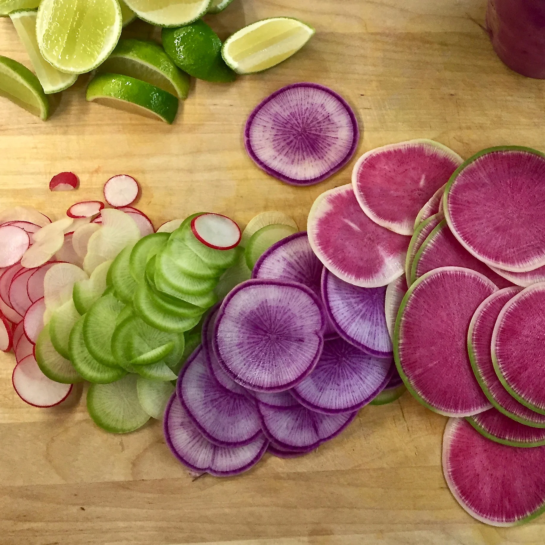 Peel or chop away rinds, stems, or any other parts of the future pickles that you don’t want to eat. For this quick pickle you want to prep you vegetable quite thinly or small to create more surface area to cut down the brining time. Rinse fresh herbs.